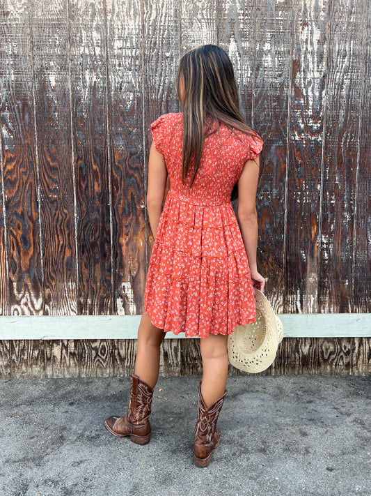 V Neck Smocked Bust Flutter Sleeve Tiered Dress