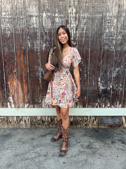 Cactus Print V Neck Smocked Bodice Dress
