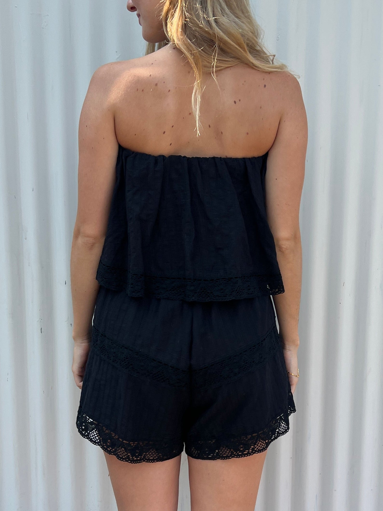 Effortlessly feminine, this strapless romper features a bandeau-style top with a wide, gathered flounce that gracefully drapes over the bust. The flounce is accented with coordinating embroidered crochet trim, adding a delicate, boho-inspired touch. The high-waisted shorts flow comfortably from beneath the flounce, with a relaxed fit and functional pockets for added convenience. Matching crochet trim on the mid-thigh and hem of the shorts completes the look, making this romper playful, stylish, and perfect for summer outings or festival-ready vibes.